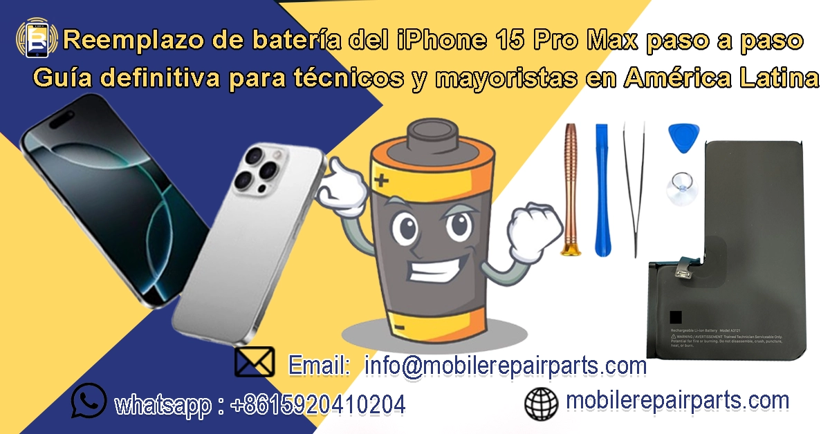 Si eres técnico de mantenimiento en Latinoamérica o te dedicas a la venta de repuestos para teléfonos móviles importados de China, esta guía está diseñada especialmente para ti. Aquí aprenderás, paso a paso, cómo sustituir la batería del iPhone 15 Pro Max de forma segura y eficaz, sin afectar al sistema iOS ni al sello del iPhone.