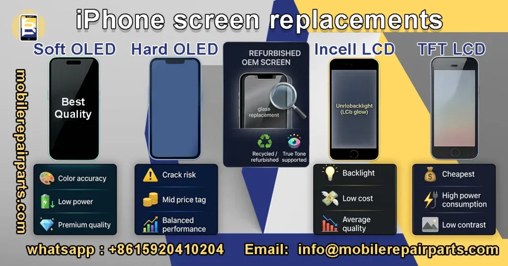 Replacement iPhone screens come in several types, including Soft OLED screens, Hard OLED screens, refurbished screens, Incell LCD screens, and TFT LCD screens.